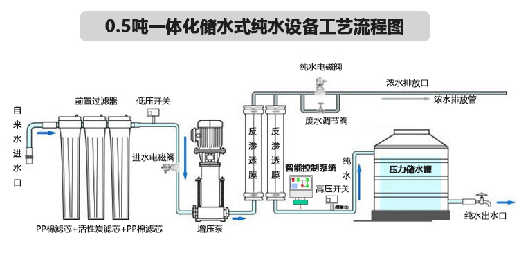 4.出水水质: 国家标准规定的电导率≤10us/cm,(除去钙镁离子,防止水垢)